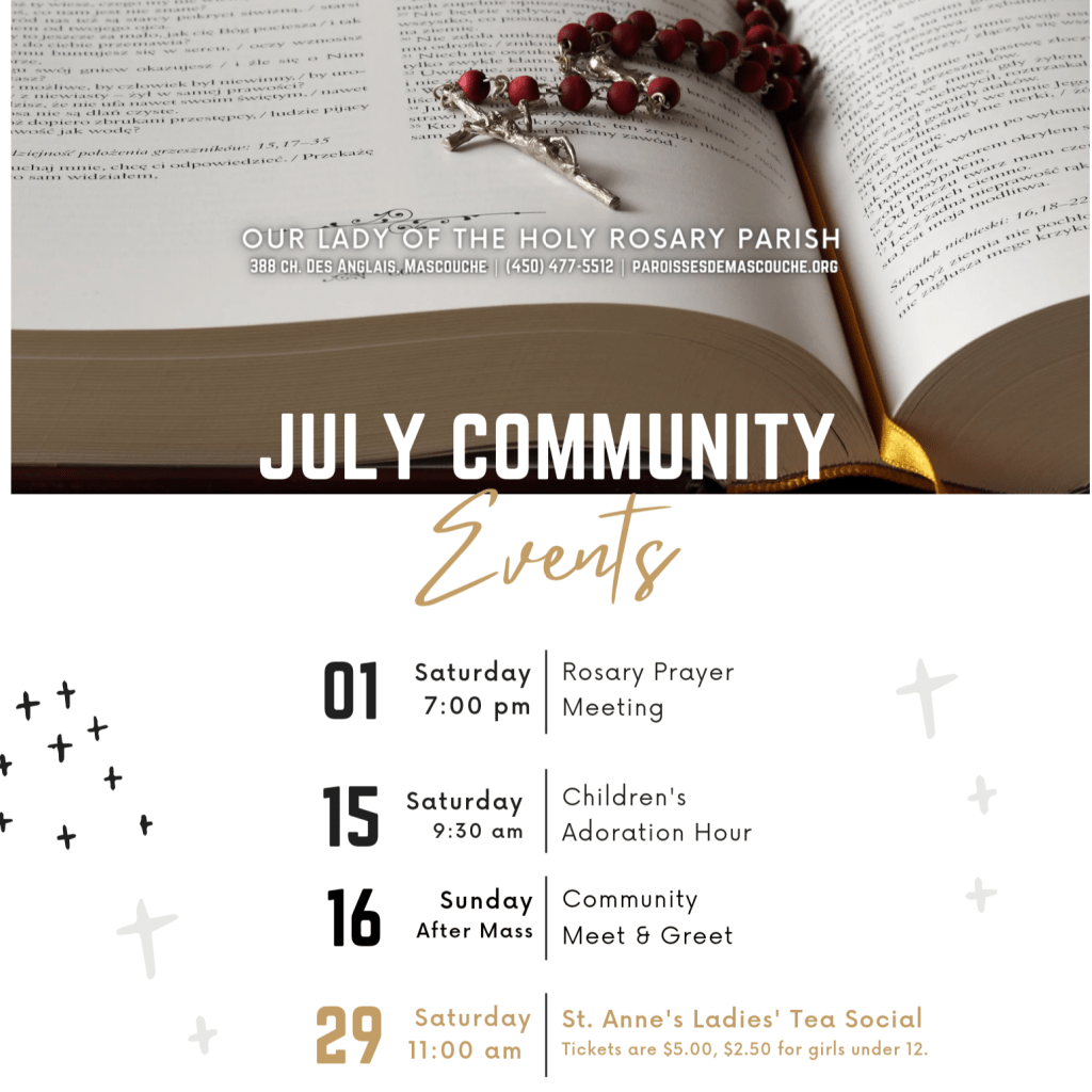 Our Lady of the Most Holy Rosary’s Fundraising & Events Committee has prepared the following community activities for the month of July. These events will be in english, at the Holy Rosary Church. All are welcome! Please contact Shanel and Jessica with any questions, comments, or suggestions via email at HolyRosaryEvents@hotmail.com